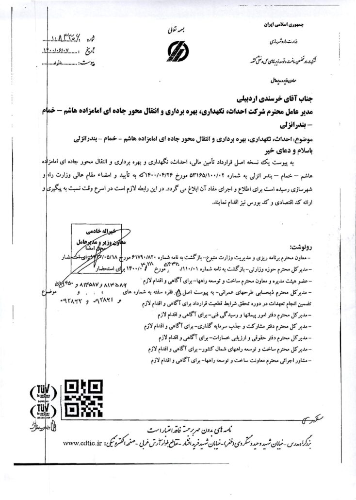 احداث ، نگهداری ، بهره برداری و انتقال محور جاده ای امامزاده هاشم-خمام-بندر انزلی