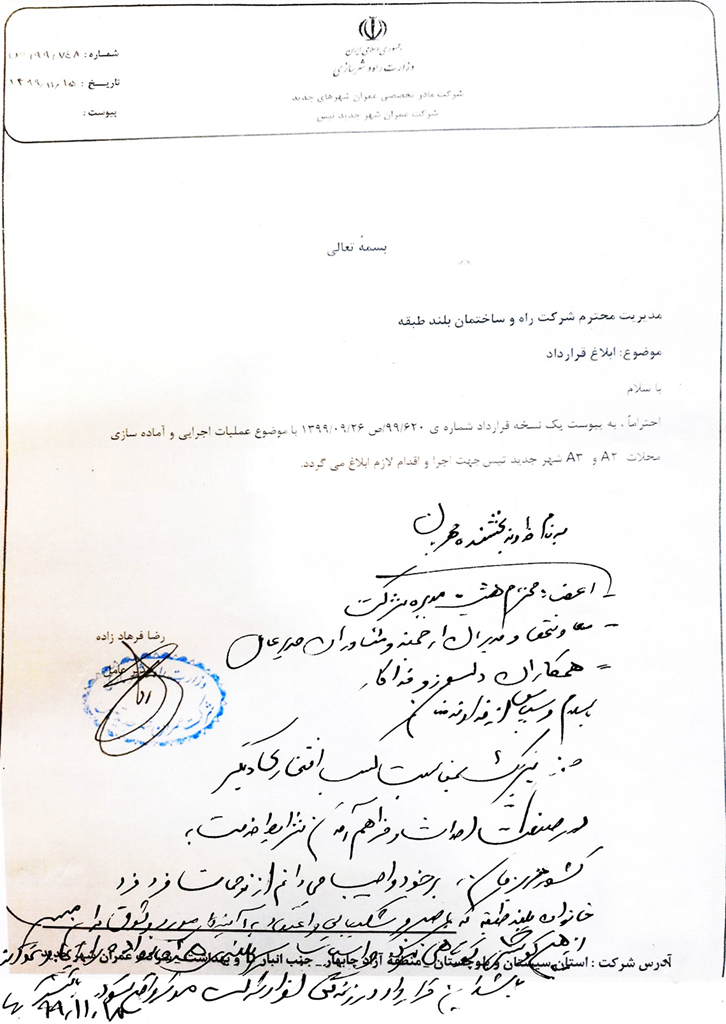 ابلاغ قرارداد عملیات اجرایی و آماده سازی قطعات A2 و A3 شهر جدید تیس